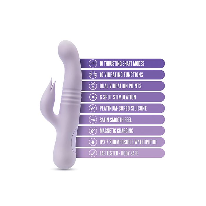 Introducing Rylee, the sleek and energetic rabbit vibrator that will Make The Bed Shake. With its elegant design, this dual stimulator offers a world of clitoral and G-spot sensations. Its rounded head is curved for comfortable insertion, featuring 10 powerful thrusting vibrations, with 3 progressive speeds & 7 creative patterns that passionately romances your G-spot. The clitoral stimulator adds 10 additional discreet vibrations, softly teasing and caressing your clitoris with delicate and tantalizing sensations. Crafted from body safe platinum-cured silicone, Rylee feels satin smooth against your skin, ensuring sensational comfort during use. With its IPX7 waterproof design and USB magnetic recharging, its ready to accompany you in the shower or bath for enhanced play. There are so many ways to inspire your most intimate moments with this massaging vibrator. Rylee is ready to go all the way till sunrise.