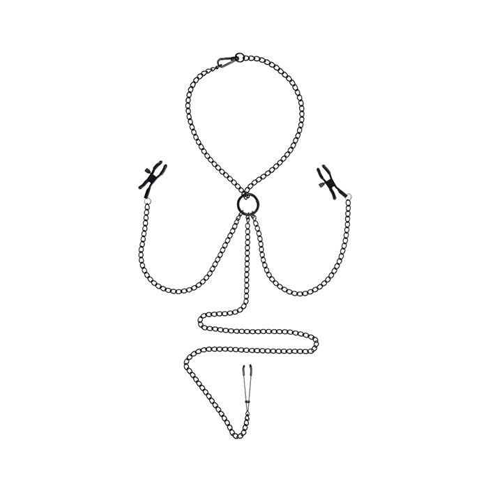 Ignite your passions and take intimacy to sensational new heights with the Saffron Nipple to Clit set. Perfectly crafted for use both in and out of the bedroom, feel the illustrious black chains drape down your body from the connected chain collar. Tease yourself with attached nipple clamps to add pressure and arousal to your most sensitive areas while a third tweezer clamp stretches down to your clit for tantalizingly seductive tension. Perfect to create heightened experiences during sensation play or as a playful reminder of your submissive place as its worn under your clothes. Secure and comfortable, the Nipple to Clit Set allows you to reign in your pleasure however you like as they tug and tease with every movement.