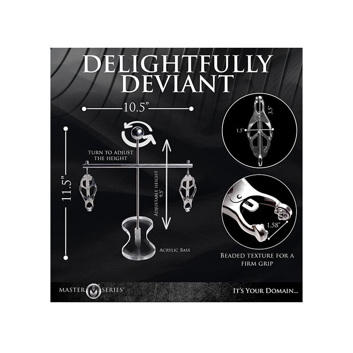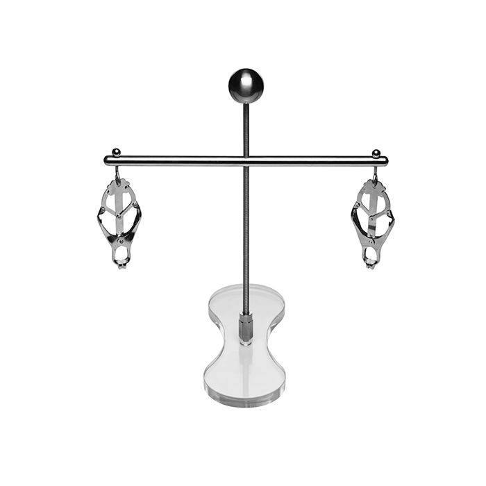 Put your submissive in a predicament pose they cant' escape with this Tower of Pain! This tower has clover-style nipple-clamps that increase in pressure when they're pulled on. The rubber tips protect the skin of the nipples and areola, but the pressure is wicked! The tower also adjusts in height so you can find the perfect height to torment them with! Made out of stainless steel, it is nickel-free and perfect for sensitive skin. The clear plastic acrylic pad sits between the nipples on their chest as a steady platform. It breaks down easily for storage or travel and can be cleaned with warm water and mild soap or a gentle cleaning solution.