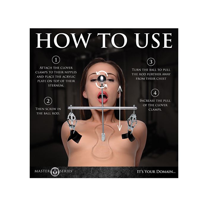 Lay them back, bare-chested, nipples exposed. Place the acrylic platform on their chest and then attach each of the clamps to their nipples. Grab the nipple, clamp onto the areola behind the nipple, and slowly release. As they get used to this sensation, crank up the height a little! Every time they relax their posture, the intensity of pressure increases! Tease them and play with them as they are held in place by this intense tower of pain!