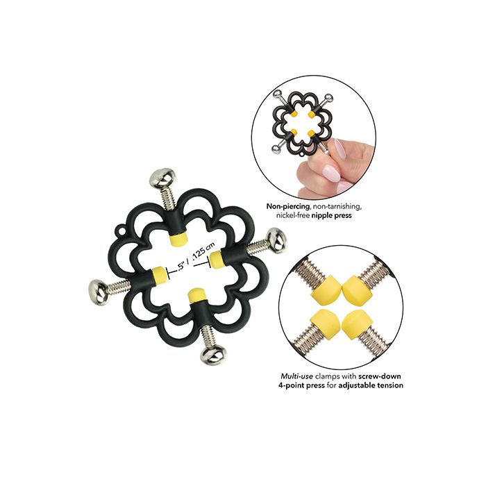 Elevate sensation and embrace endless pleasure possibilities with the Boundless™ Nipple Grips. The multi-use clamps are made to explore elevated sensation with the screw down 4-point press design and heavy-duty feel. Find what hits just right with the fully adjustable screw-down 4-point press, while the power grip cote tips hold tight for the thrill of a lifetime. Clamp the naughty grips to the nipple or anywhere on the body and enjoy every rush of pain and pleasure with each tug. The teasing clamp has fully adjustable 4 points of tension to stimulate anywhere on your body for playful teasing. As the tension tightens, the tingles intensify with every turn of the screw for the ultimate in nipple stimulation toys. These easy-to-use nipple teasers are great for everyone.