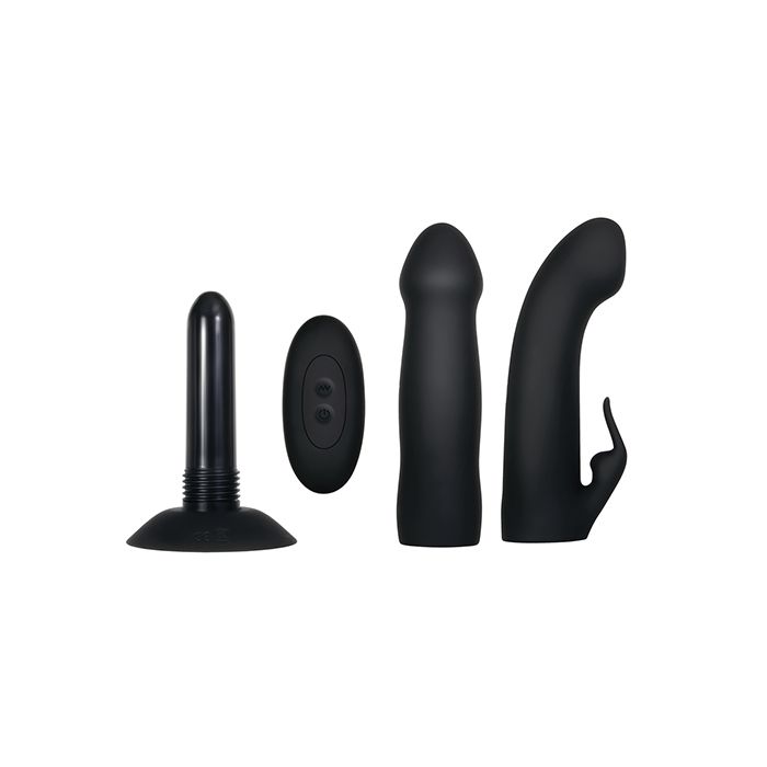 Strap yourself in for creative pleasure possibilities! This unique toy & harness kit lets you play how you want with a powerful vibe that comes with two different silicone sleeves – one G-spot rabbit shape and the other girthy traditional. Use the suction cup base for hands-free or slip your vibe through the harness for strap-on fun! The remote control allows you or a partner to take the reins and explore 10 different speeds and functions - and don’t worry about playing hard – the sleeves screw on tight for sturdiness, even under water as the vibe is completely submersible. Remote hands-free vibrator with 2 sleeves & harness. 2 unique sleeves slip over vibe – G-spot rabbit & girthy traditional . Sleeves screw on to vibe for secure fit . 10 vibrating speeds & functions in powerful motor . Suction cup base for hands free play on any surface or fits in harness . Vibrator made from durable ABS plastic . Sleeves & remote made from creamy smooth silicone . Harness made from vegan leather & nylon . Comfortable fully adjustable straps . Soft padding around waist eliminates chafing . 1-button control at base of toy . 2-button remote control . LED illuminates button when in use .