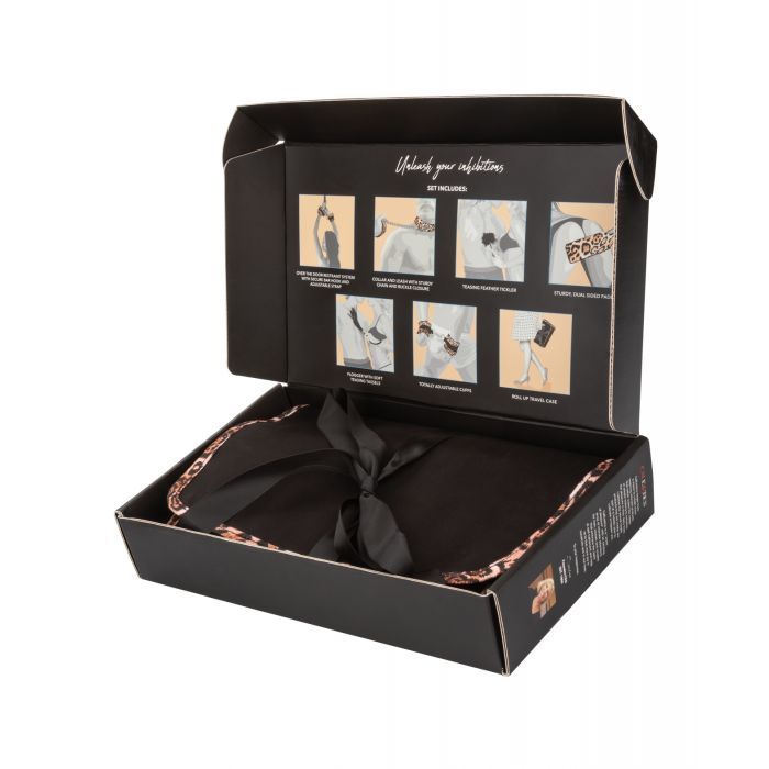 Give yourself over to the thrilling world of submission and dominance with the Unleashed™ Adventure Set. This travel-ready set includes everything needed to tease the lines between pleasure and pain. The designer 7-piece kit includes a faux leather flogger, sturdy dual-sided paddle, fluffy feather tickler, padded collar, chain leash, over the door restraint system and roll up travel case with hook. Lose yourself to pleasure with the versatile cuffs with adjustable Velcro® style enclosure, wrap around wrists or ankles for sensual submission. Tease as you build up the anticipation with the flirty feather tickler. Wrap the adjustable collar around your lover, clip on the durable chain leash and lead them towards pure pleasure as you take command. From every teasing tickle down their body to stinging slap, the flogger with tickling tassels is sure to thrill. From rewards to punishment, the sturdy dual sided paddle is made to plant powerful smacks. No matter how much you squirm, the over the door restraint system with adjustable straps will hold you just right when paired with the adjustable cuffs. From hot honeymoons to nightly adventures, the discreet roll up travel case is sure to hold onto all your dirty secrets between session.